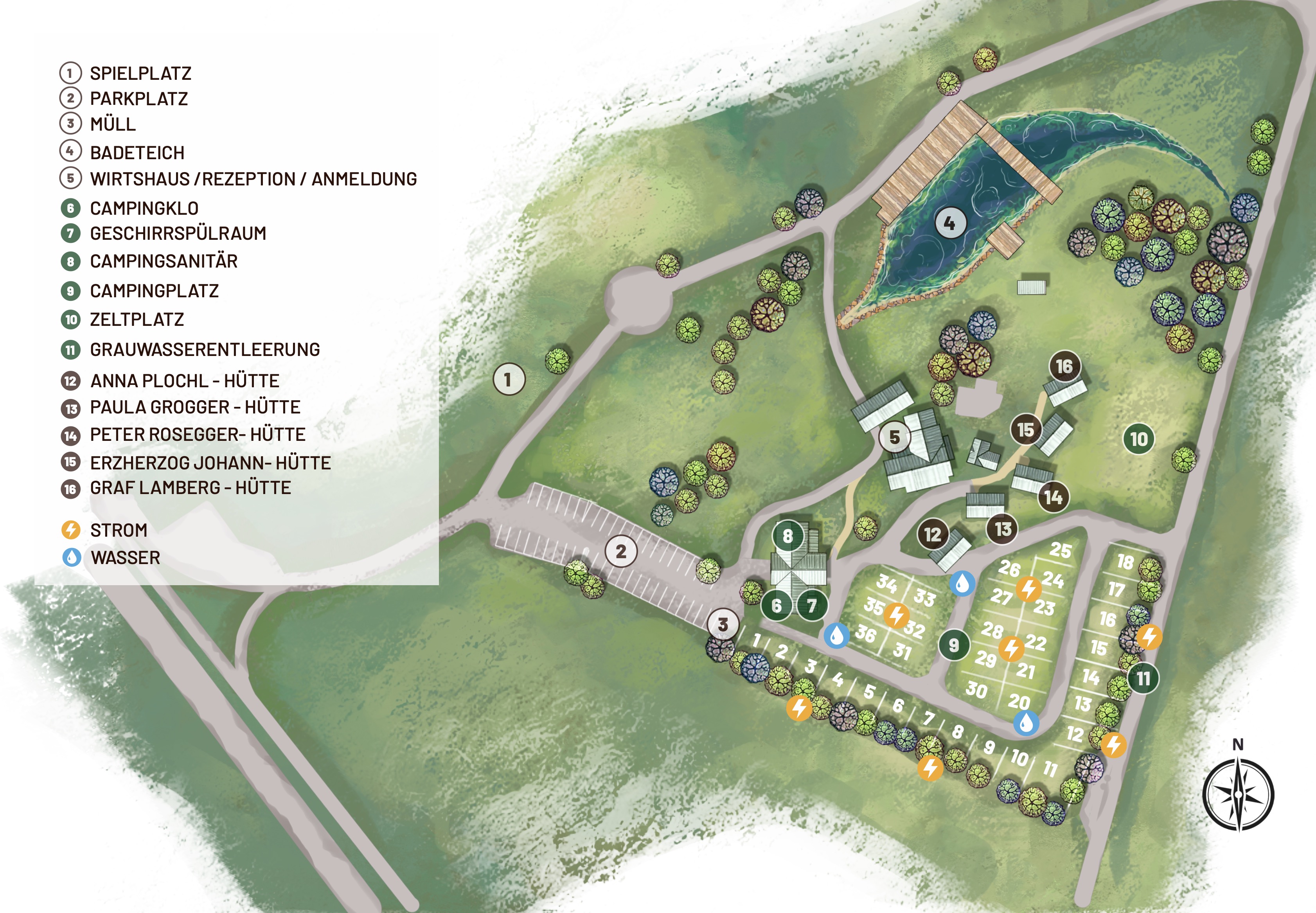 Ca. 100m² parzelliert, gekennzeichnet mit Nummerierung am Boden, Stromanschluss (siehe Platzplan Stromkästen) Wasser siehe Brunnen laut Platzplan Gratis WIFI Der Untergrund vom Stellplatz ist Wiese. Das Auto kann am Platz abgestellt werden, ansonsten am Parkplatz vor der Anlage. Pro Stellplatz ist ein Hund erlaubt.